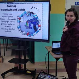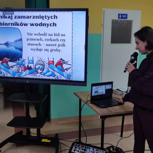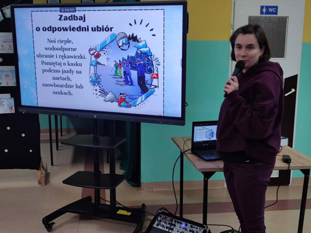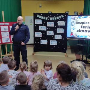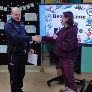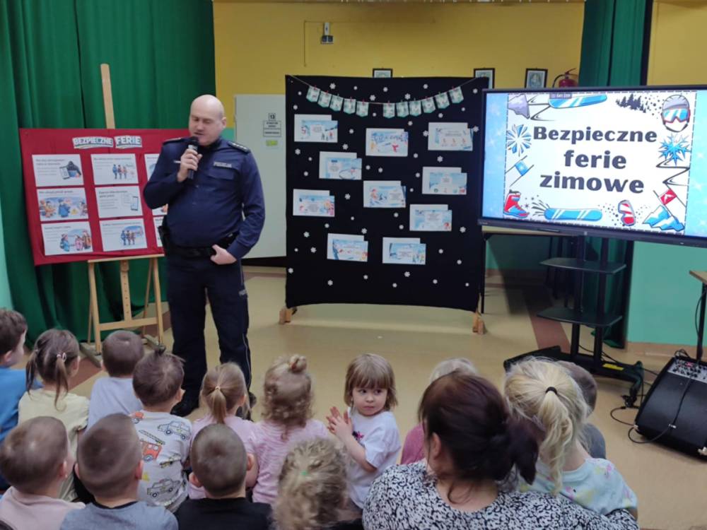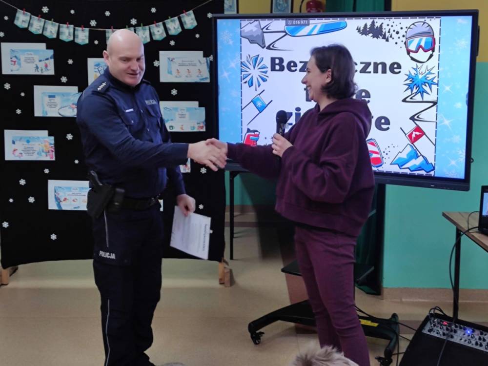 Uczniowie z dużym zainteresowaniem słuchali prelekcji, aktywnie uczestniczyli w rozmowach, zadawali pytania i chętnie dzielili się swoimi doświadczeniami. Spotkanie było doskonałą okazją do utrwalenia wiedzy oraz przypomnienia, że bezpieczeństwo jest najważniejsze – również podczas zabawy. Serdecznie dziękujemy p. aspirantowi sztabowemu Jarosławowi Guzowi za wizytę w naszej szkole, cenne wskazówki oraz poświęcony czas. Takie spotkania mają ogromne znaczenie dla kształtowania odpowiedzialnych i świadomych postaw wśród dzieci i młodzieży. Na zakończenie życzymy wszystkim uczniom bezpiecznych, radosnych i pełnych uśmiechu ferii zimowych, które nadchodzą wielkimi krokami.