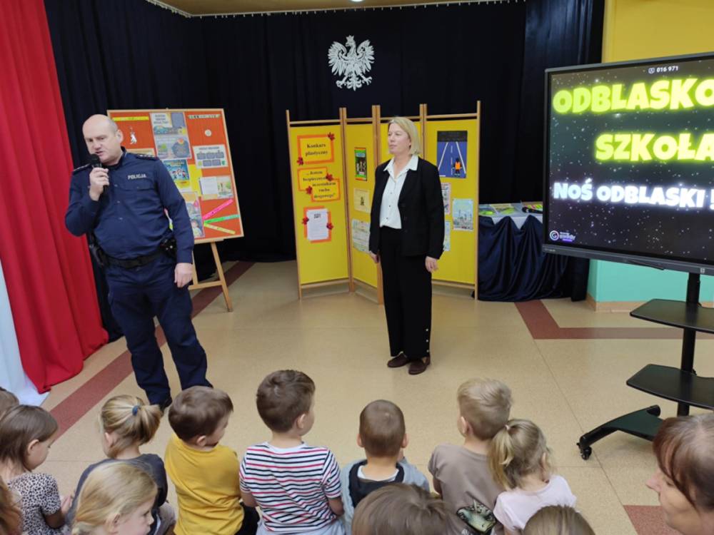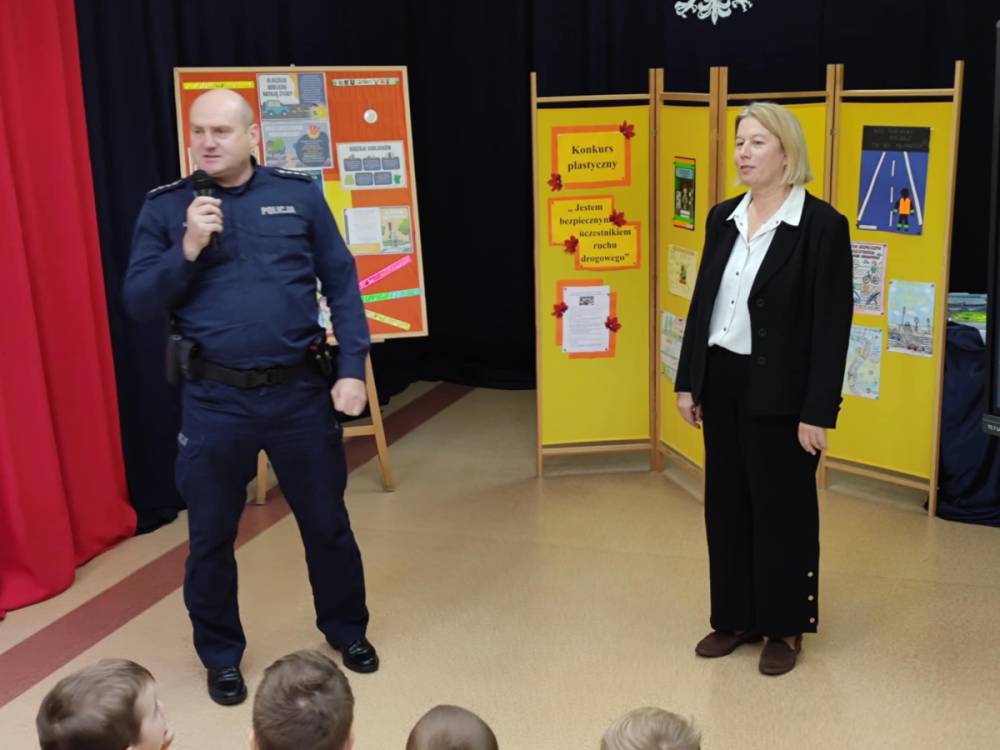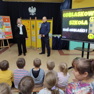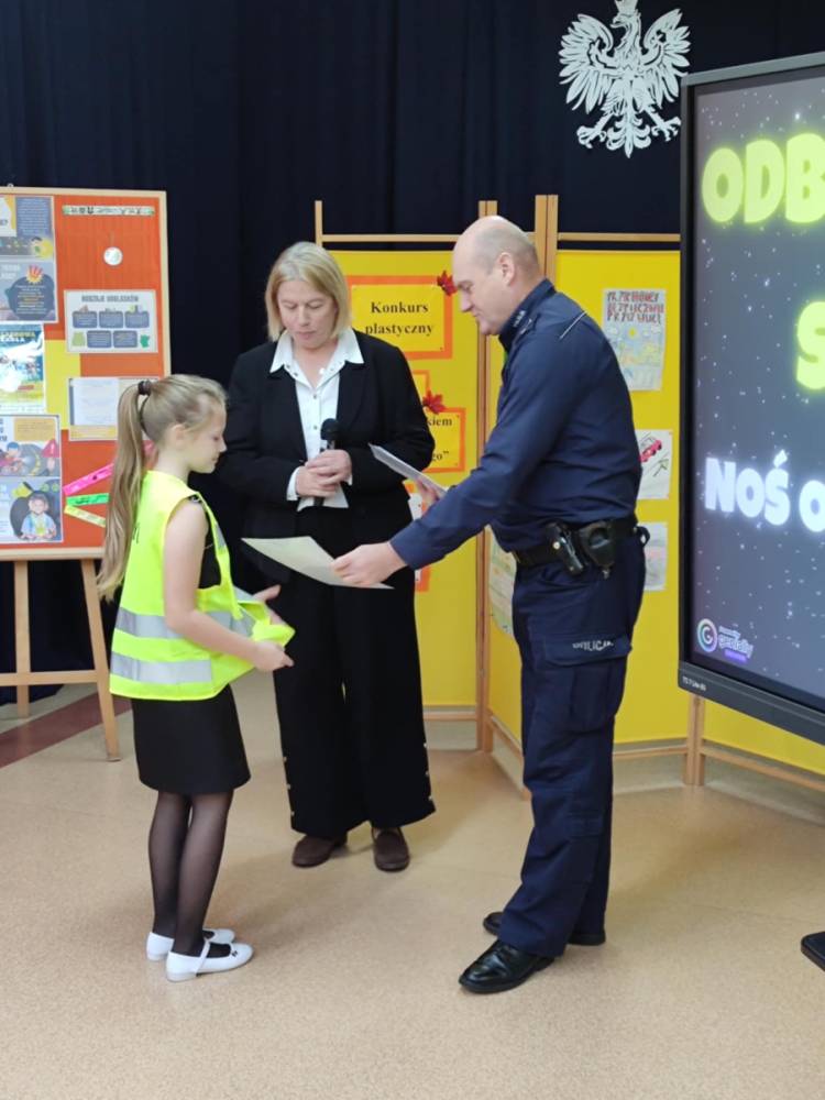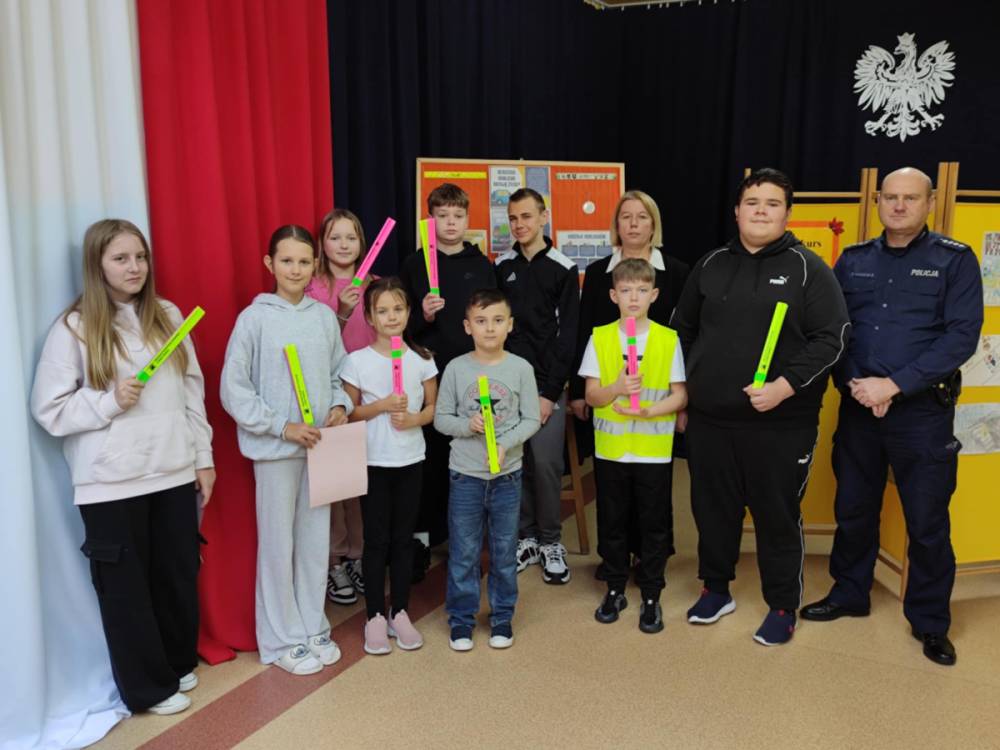 Na uroczystości gościliśmy naszego dzielnicowego asp. szt. Jarosława Guza, który w ciekawy sposób opowiedział o zasadach poruszania się po drogach i konieczności noszenia odblasków po zmroku.