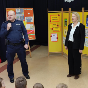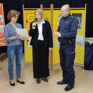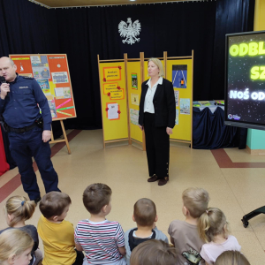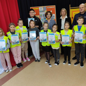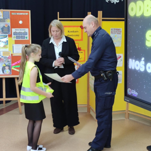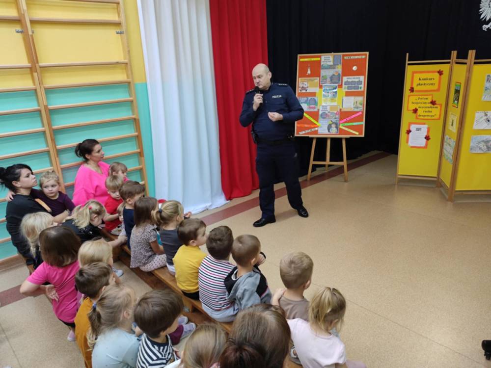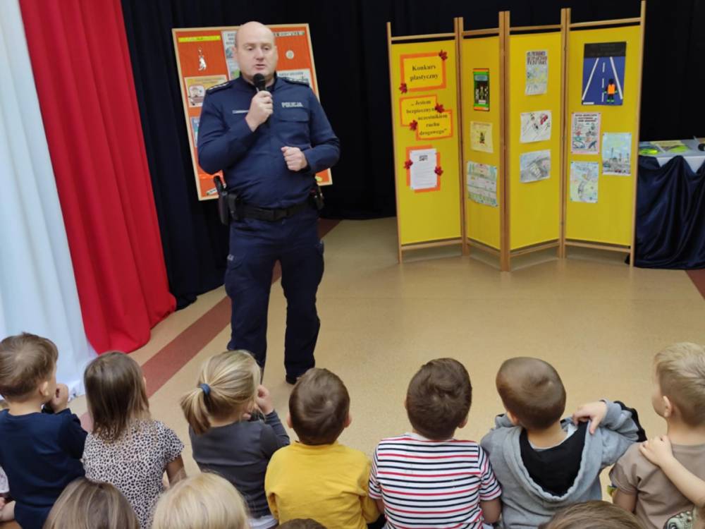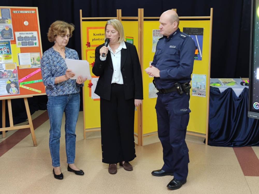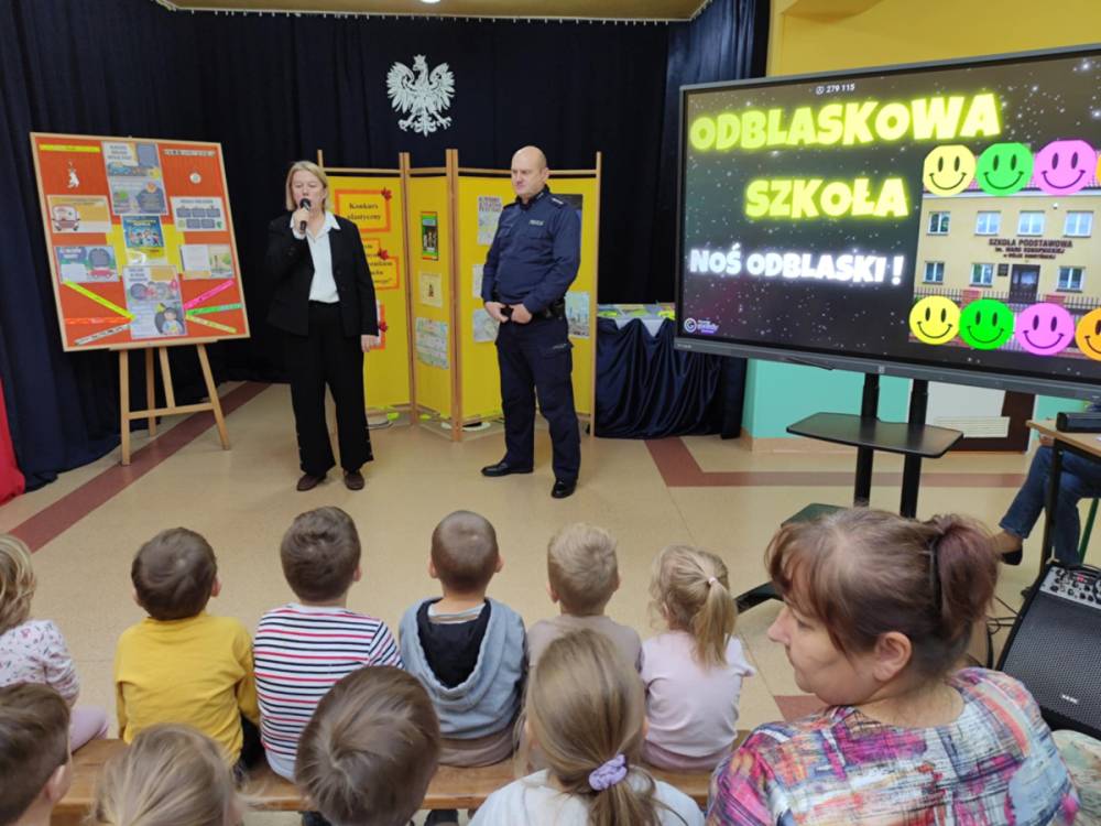 Na uroczystości gościliśmy naszego dzielnicowego asp. szt. Jarosława Guza, który w ciekawy sposób opowiedział o zasadach poruszania się po drogach i konieczności noszenia odblasków po zmroku.