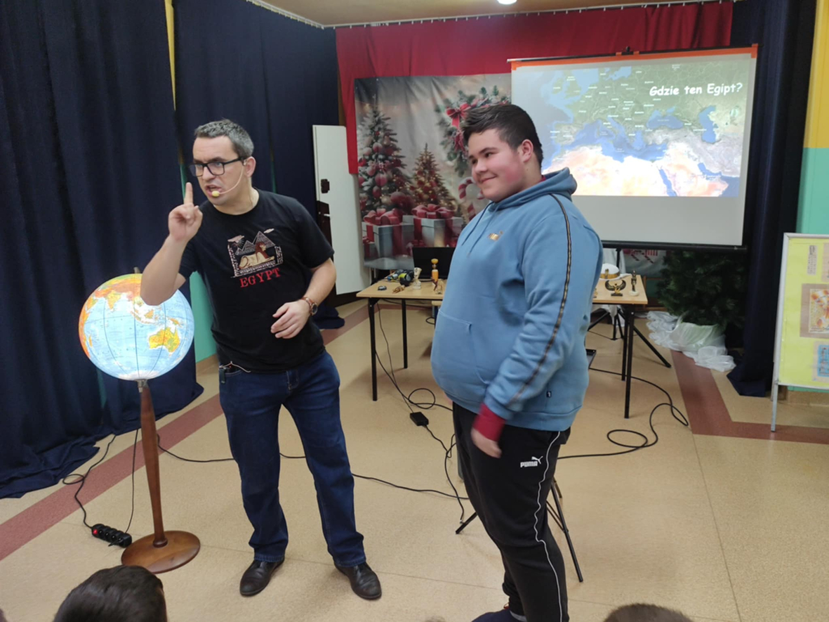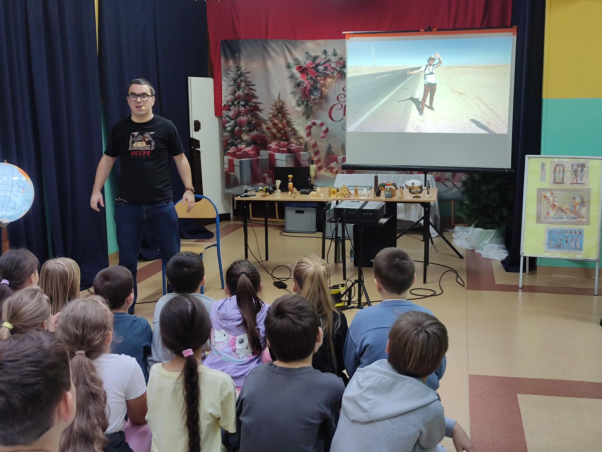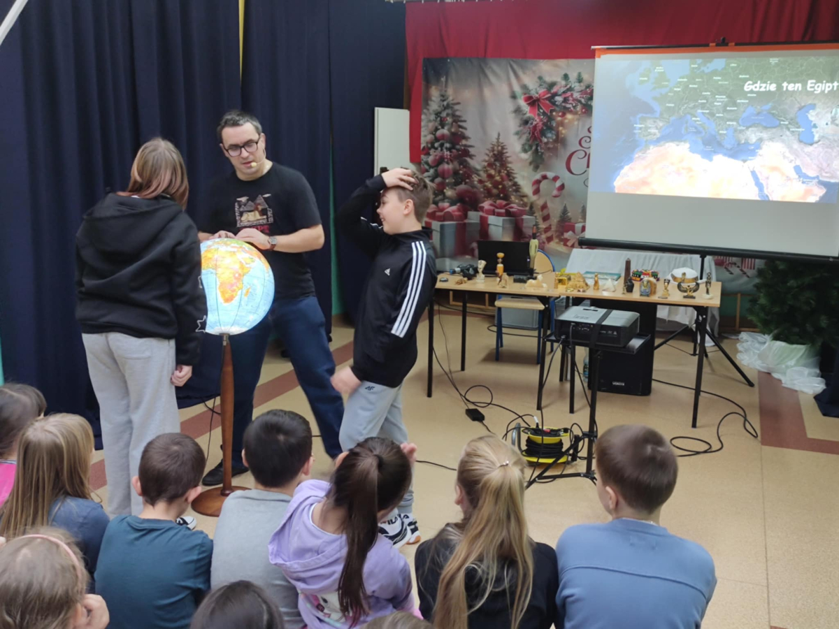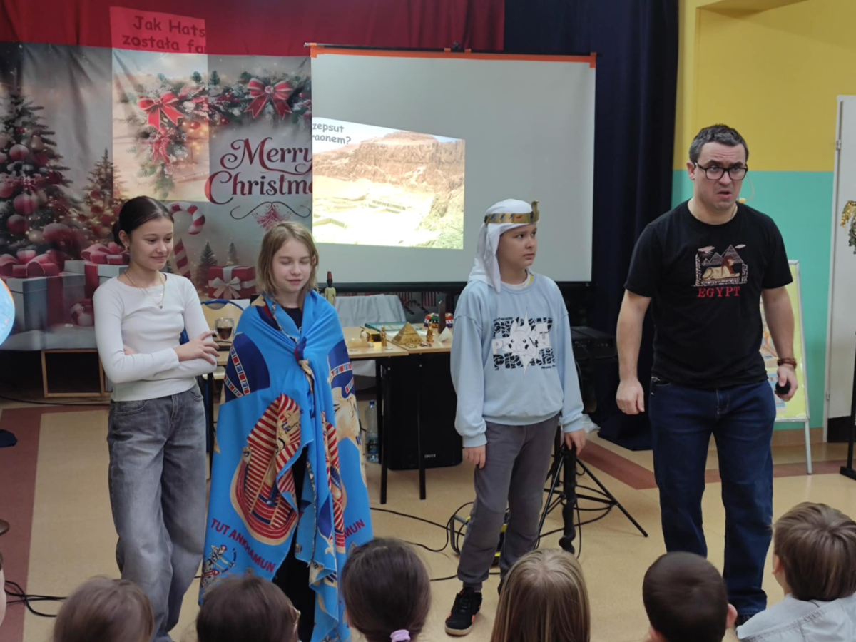 W czwartek 11.12.2025 r. mieliśmy zaszczyt gościć w naszej szkole podróżnika Pana Mateusza Chołodego– człowieka pełnego pasji, energii i niesamowitych historii. Jego lekcja pt. „Egipt – kraina nad wielkim Nilem” okazała się jednym z najbardziej inspirujących wydarzeń tego roku szkolnego! Już od pierwszych minut spotkania czuliśmy, że czeka nas coś wyjątkowego. Pan Mateusz zabrał nas w barwną opowieść o Egipcie, który dla wielu z nas kojarzył się głównie z piramidami i faraonami. Tymczasem dowiedzieliśmy się o wiele więcej!