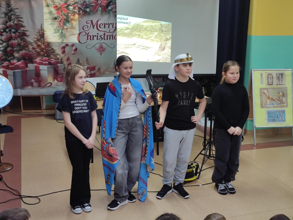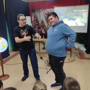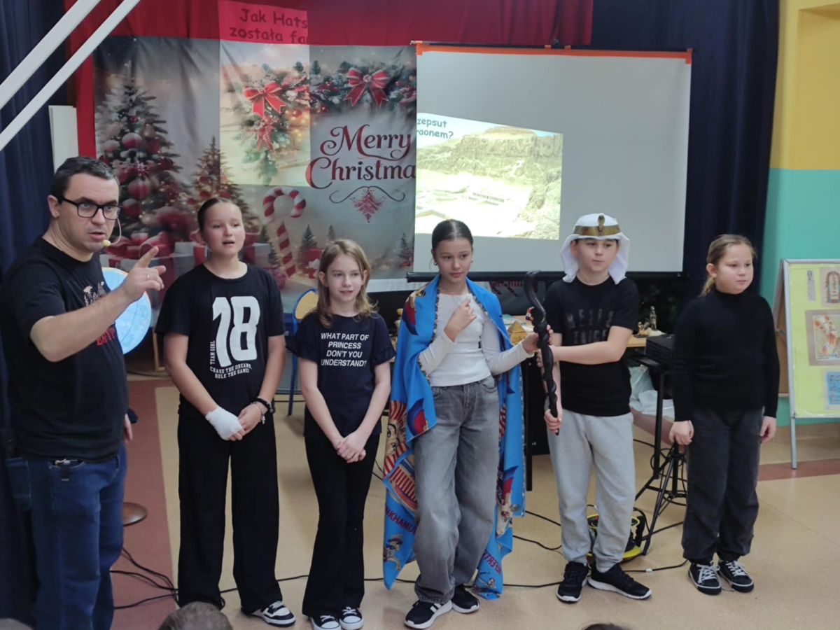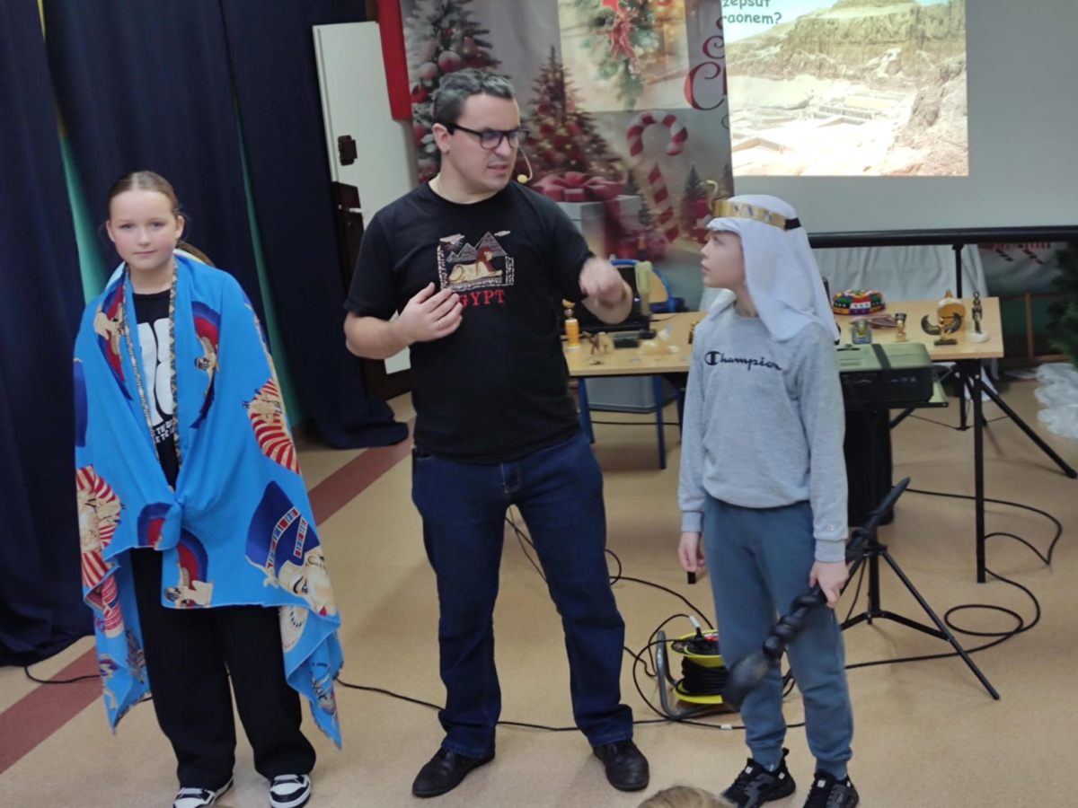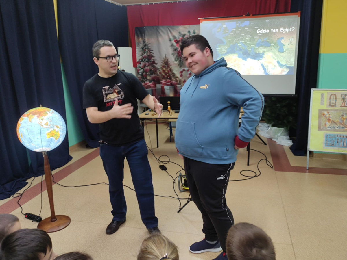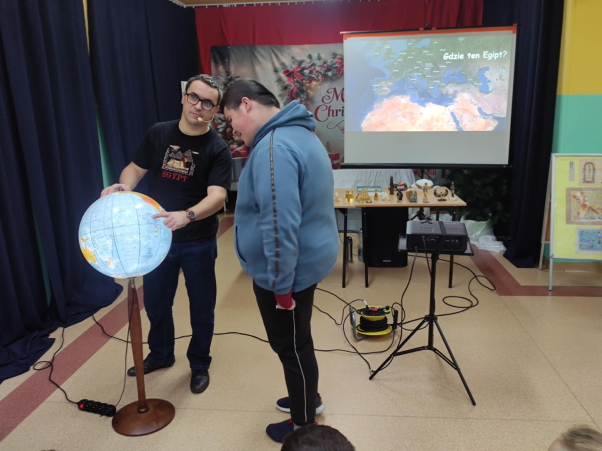W czwartek 11.12.2025 r. mieliśmy zaszczyt gościć w naszej szkole podróżnika Pana Mateusza Chołodego– człowieka pełnego pasji, energii i niesamowitych historii. Jego lekcja pt. „Egipt – kraina nad wielkim Nilem” okazała się jednym z najbardziej inspirujących wydarzeń tego roku szkolnego! Już od pierwszych minut spotkania czuliśmy, że czeka nas coś wyjątkowego. Pan Mateusz zabrał nas w barwną opowieść o Egipcie, który dla wielu z nas kojarzył się głównie z piramidami i faraonami. Tymczasem dowiedzieliśmy się o wiele więcej!
