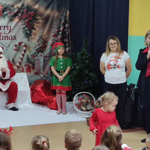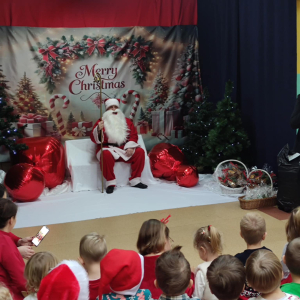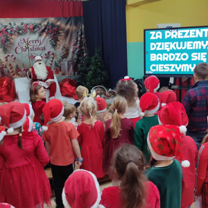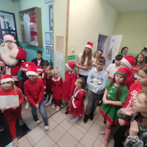 Dla Mikołaja przygotowano taniec oraz wspólny wierszyk, który dzieci zaprezentowały z wielkim zaangażowaniem. Wszyscy w radosnym nastroju współtworzyli to świąteczne widowisko – pełne ruchu, rytmu i świątecznej energii. Mikołaj był wzruszony i nie przestawał się uśmiechać!