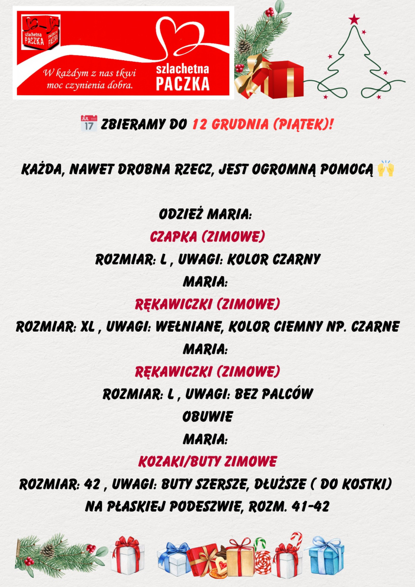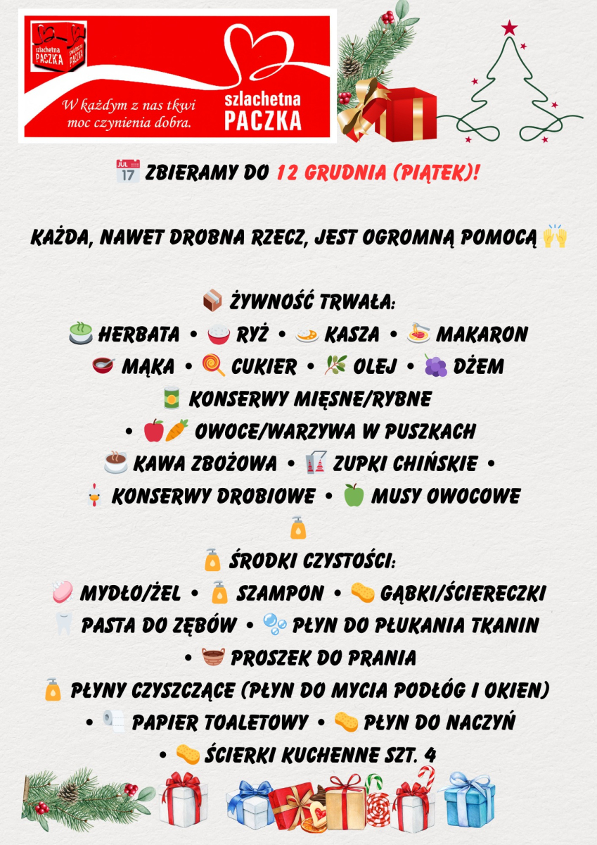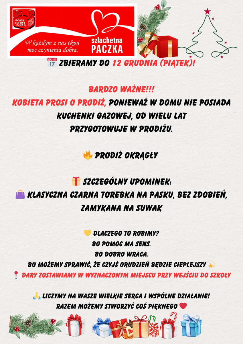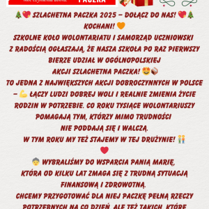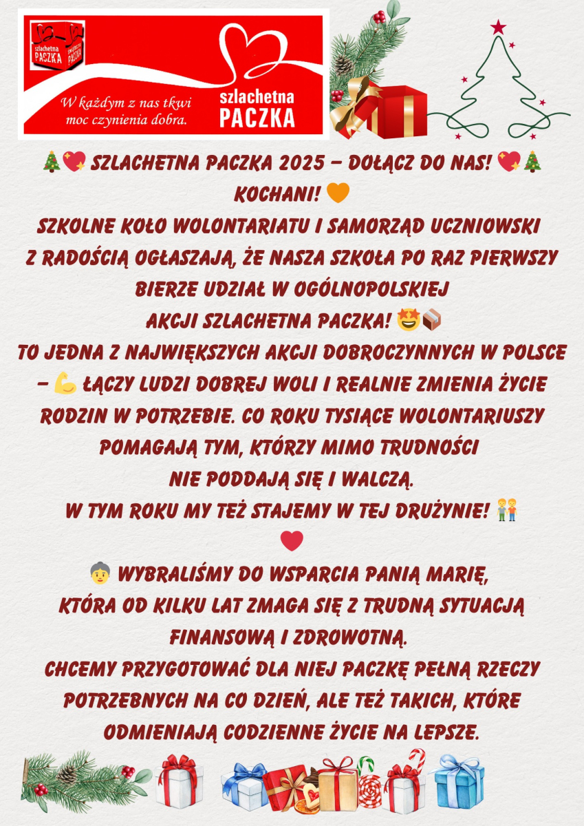 Z ogromną radością informujemy, że po raz pierwszy nasza szkoła bierze udział w ogólnopolskiej akcji Szlachetna Paczka! To jeden z największych projektów pomocowych w Polsce, który łączy ludzi i odmienia życie rodzin oraz osób w potrzebie