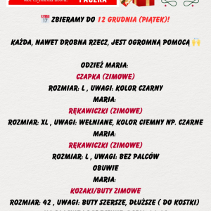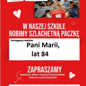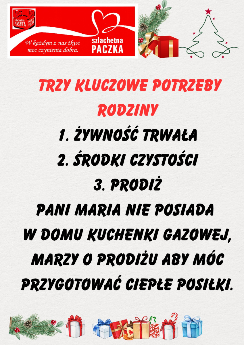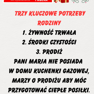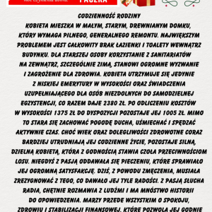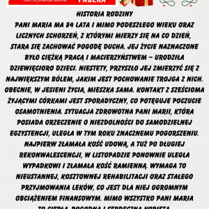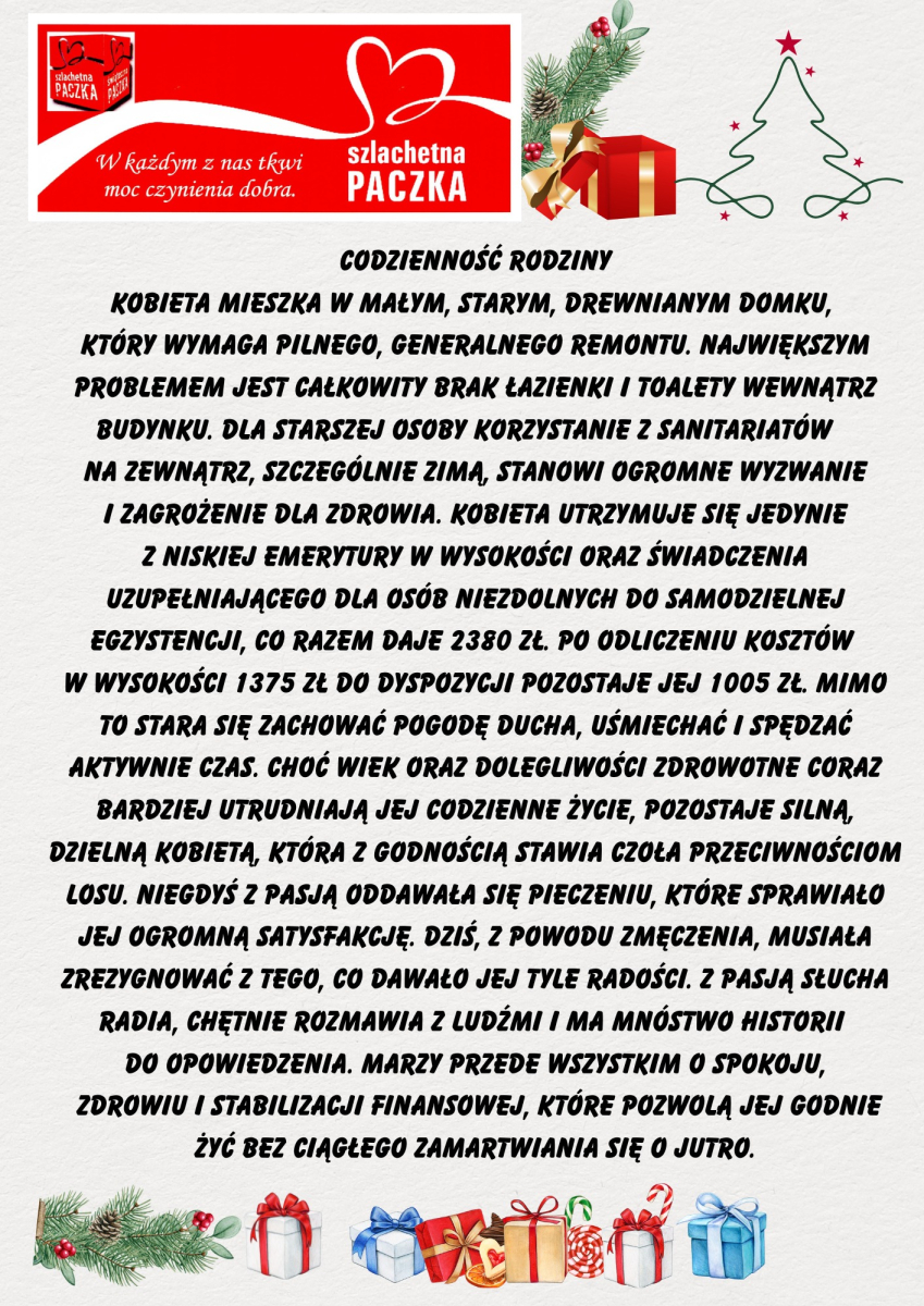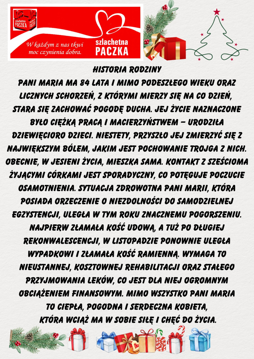 W tym roku wspieramy Panią Marię, która znajduje się w trudnej sytuacji życiowej i codziennie mierzy się z wieloma wyzwaniami. Chcemy sprawić, by nadchodzące Święta były dla niej czasem spokoju, bezpieczeństwa i radości