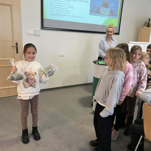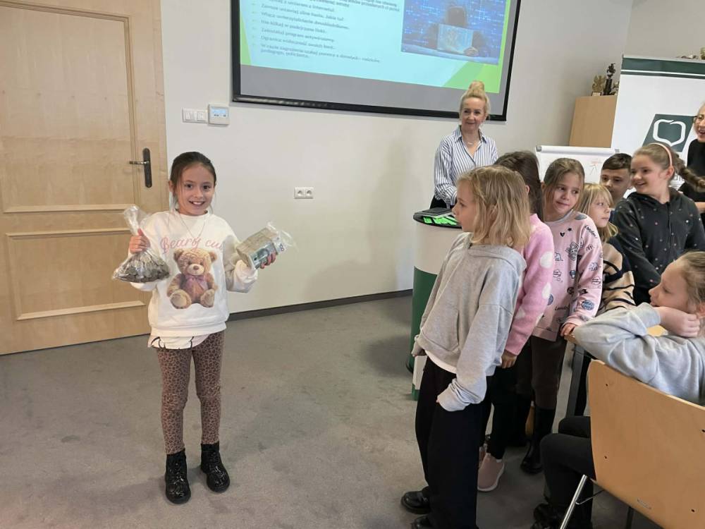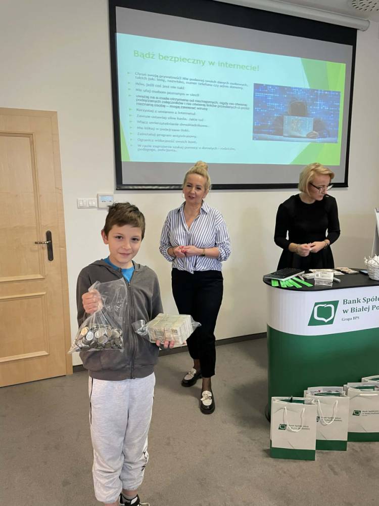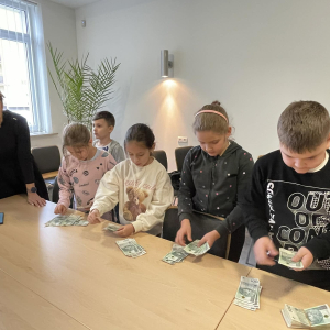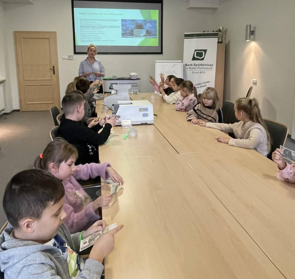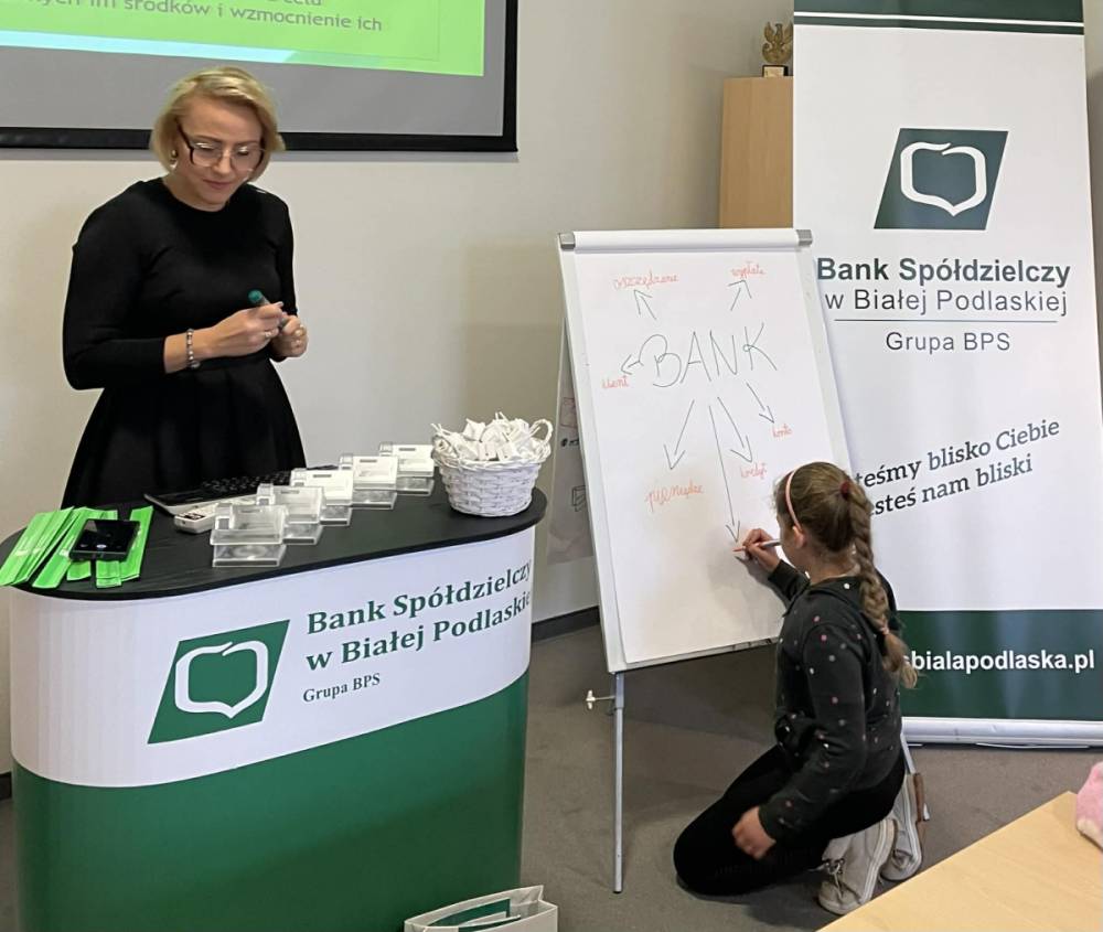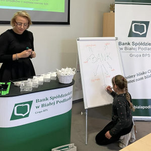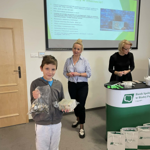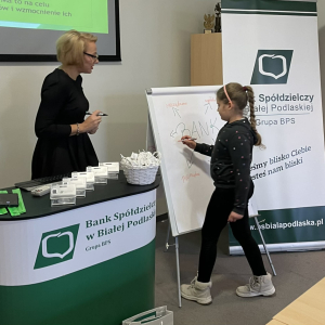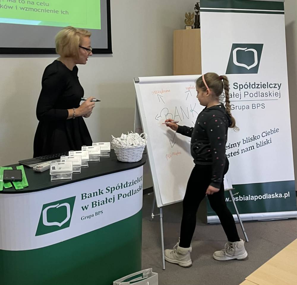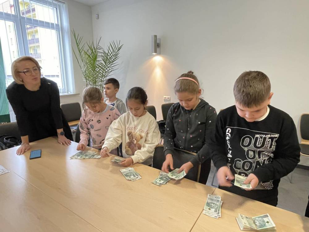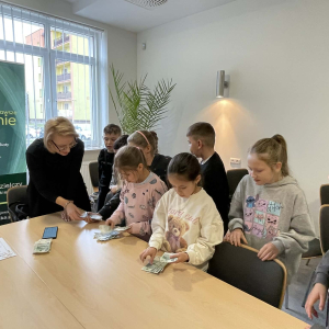 Na początku spotkania dzieci zostały powitane przez pracowników banku, którzy w bardzo ciekawy sposób opowiedzieli o codziennej pracy w banku.