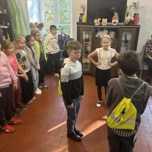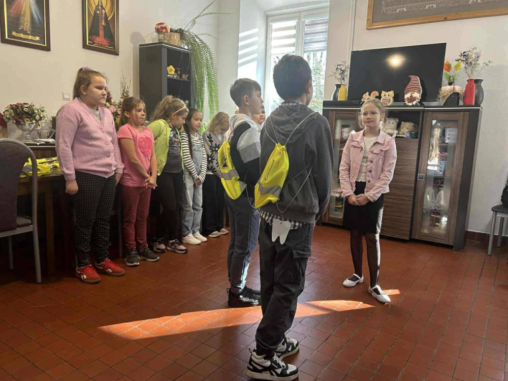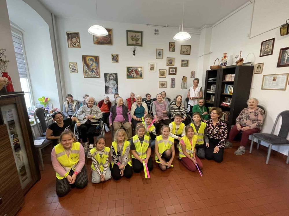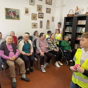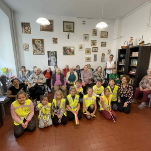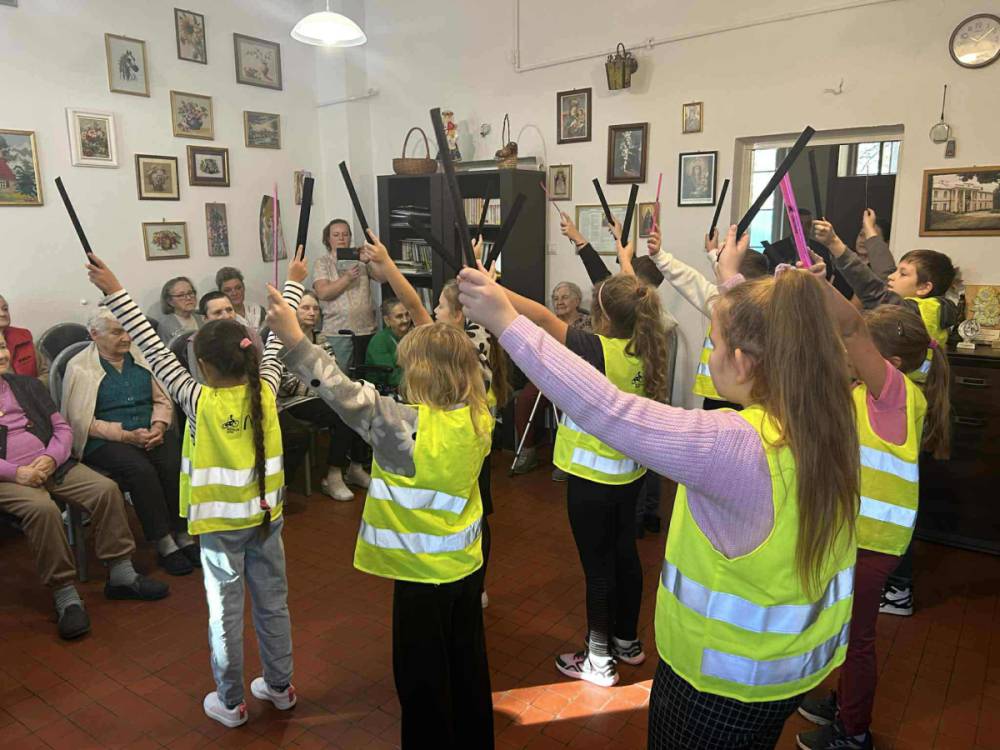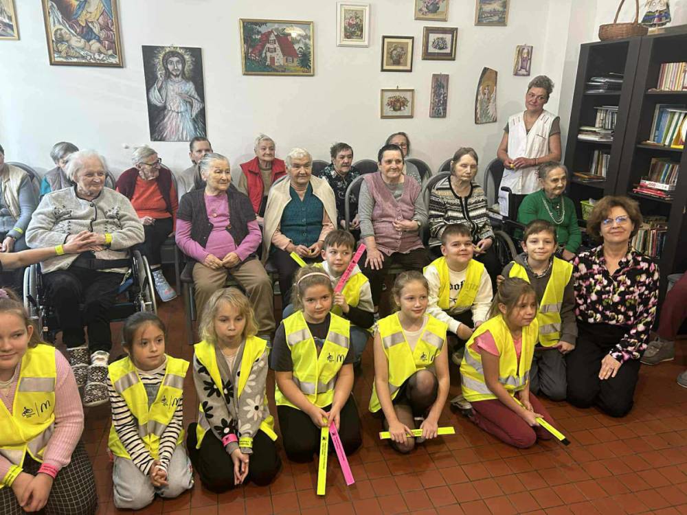W ramach działań konkursowych nasza szkoła zorganizowała szereg inicjatyw profilaktycznych. Jednym z głównych punktów programu było włączenie seniorów w działania edukacyjne i skierowanie akcji również do nich. Dlatego dnia 13 listopada 2025 roku uczniowie zaprezentowali w Domu Seniora w Kodniu przedstawienie profilaktyczne poświęcone bezpiecznemu poruszaniu się po drodze po zmroku a także znaczeniu noszenia odblasków. Spotkanie to stało się okazją do wspólnego utrwalenia wiedzy o bezpieczeństwie przez dzieci i seniorów.